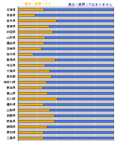こちら、わたくし、最初から気になる県がありました。 それは、 美人の産地で名高い、 秋田県と福岡県です! さあさあ見てみましょう。 ぐぐぐと!! 秋田県: 美女(美男)です=36.4% 美女(美男)ではありません= 63.6% 福岡県: 美女(美男)です=37.1% 美女(美男)ではありません= 62.9% ふ、ふつう!!! ‥‥ありがとうございました。 さて、以下に、「美女(美男)です」と 「美女(美男)ではありません」のベスト5を それぞれ出してみました。 (軽い気持ちで見てください!) 「美女(美男)です」ベスト5は 1位 京都府 2位 海外 3位 奈良県 4位 徳島県 5位 石川県 です。 京都府のみなさん、おめでとうございます! 問題は、第2位です。 2位 海外 美女&美男、海外流出!! 「美女(美男)ではありません」ベスト5は 1位 鳥取県 2位 島根県 3位 愛媛県 4位 栃木県 5位 青森県 え、文字が小さくてよく見えない? まあいいじゃないですか。はははははははは。 さて。結果の予想を見てみましょう。