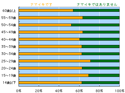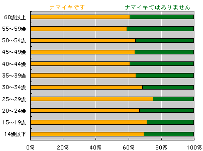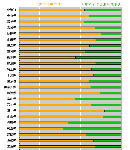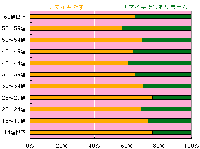 日本人の予想するナマイキの割合は、 実際の結果と、逆!! と、いうことは、どういうこと? え??? えーと、全体の結果から言って ナマイキさんがここにいて、 も1人ナマイキさんがいたら 非ナマイキさんが1人どこかにいるのだけど、 みなさんの予想では、ナマイキさんが 1人いれば、非ナマイキさんは2人いるはずで‥‥ ああ! ややこしい! おおざっぱに言って、 「わたしはナマイキ」と 思っていらっしゃるみなさーん。 考えているよりも、 周囲はナマイキだらけ!! ですよ。 安心しましたか? それとも、不安になったでしょうか。 非ナマイキさんは、 どちらにしても不安かも‥‥? さて、それぞれの集計を見てみましょう。