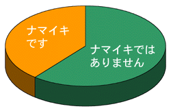 みなさんこんにちわ。さいとうりかです。 「ナマイキですか?」 またまた面と向かって聞きにくいことを お聞きし、ご丁寧に お答えいただきありがとうございました。 どちらが多いという結果がうれしいのか にわかにわかりかねますが、結果を発表しましょう。 ごにゃごにゃ言わずにいってしまいましょう。 総回答数は、2,590。 結果を発表します!!