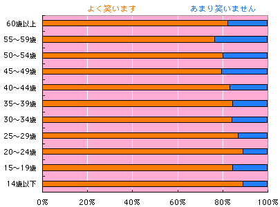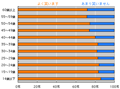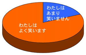 笑ってます笑ってます! だって、8割ですよ。 ひとクラス40人中32人がよく笑うひとです。 記念写真を撮るときの 「はい、チーズ」とか、 必要ないんじゃないでしょうか。 この結果を「日本人の思いのものさし」でいうと、 「日本人は、 それはもうよく笑います」 となりました。 さて、それぞれの集計を見てみましょう。