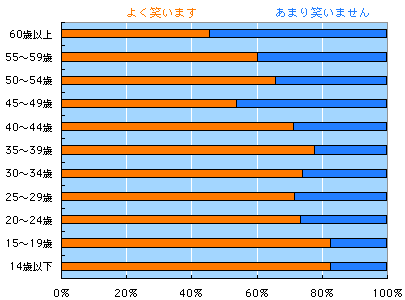 今回も、女性の方が多いようです。 まあ、男性の方が笑わないというのは、 いわゆる日本男児のイメージから、 そうなんじゃないかしらと思っていた方々も 多いと思います。 はっきりと証明されたようですね。 でもけっこう、73.1%というのは 多い気もします。 うーんうーんうーん。 これって多いのか少ないのか。 高倉健さんに聞いてみたいです。 無性に。 年齢別、性別など、詳しい集計をご覧ください。