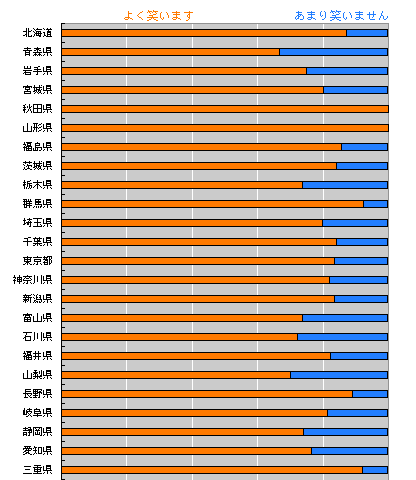 男性も女性も、 年齢が低いときの方がよく笑う ようです。 40代後半から急に下がりますね。 笑ってばかりもいられない、 夢見る少女じゃいられない(by 相川七瀬)、 分岐点は、45歳! 次は、住んでいるところ別です。 笑いに厳しいあの県は どうなのでしょうか?
