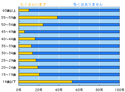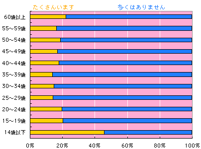 14歳以下の方と、50歳代の方が、 比較的「ともだちがたくさんいる」となりました。 14歳以下の方々は、義務教育中ですから、 同世代ので固まってることが、 ともだちの多い理由かもしれませんね。 50歳以上、とくに後半、ということは‥‥。 もしかして、あれでしょうか。 堺屋太一さんが命名された戦後のベビーブームの方たち、 そう、あの有名な 、 団塊の世代だから!? わー。もしそうだとすると、やっぱり、 「年の近い人がそばにたくさんいると ともだちが多くなる」 ことの実証になるかもしれません! 次は、住んでいるところ別です。