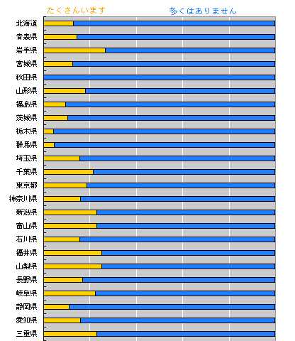 「ともだちがたくさんいます」ベスト5は 1位 鳥取県 2位 大分県 3位 佐賀県 4位 熊本県 5位 岩手県 「ともだちが多くはありません」ベスト5は 1位 長崎県 1位 秋田県 3位 栃木県 4位 群馬県 5位 香川県 でした。 ‥‥すみません、まった理由がわかりません! とくに、飛び出て多い鳥取県!! なにかおわかりになったら、教えてください!! では、最後に、結果の予想です。 最初にちょっとふれましたとおり、 逆の「たくさんいます」の方がもっと多いと 予想した方が半数近くいらしたようです。