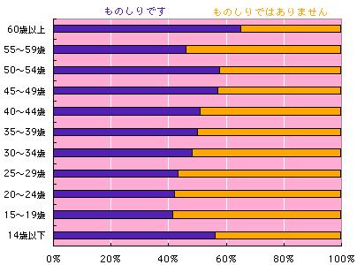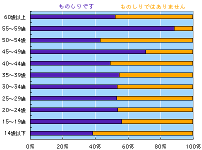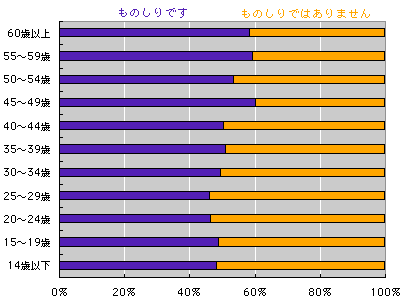 男性のほうがものしりです。 理由は、不明。 感想は、「ふうん」ですね。 ‥‥‥‥‥‥。 す、 すみません。 あまりにもとっかかりがないので‥‥。 年齢別、性別の詳しい集計をご覧ください。