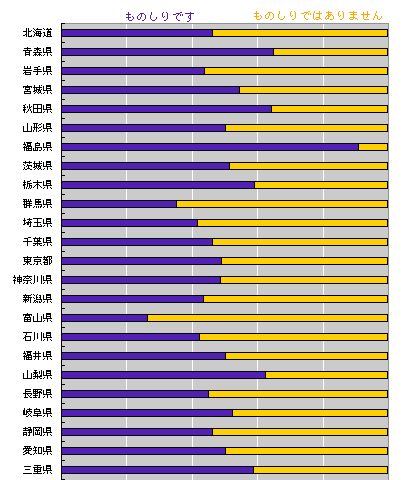 「ものしりです」ベスト5は 1位 福島県 2位 大分県 3位 山口県 4位 島根県 5位 高知県 一番のものしり県は 福島県です! これから相談先に迷ったら、 福島県の人に相談しましょう! 第2位の大分県は、 前々回の「ともだちがたくさんいますか」で2位、 前回の「約束を守りますか」で、 1位でした。 友だちが多くて、決まりを守る。 そしてものしり。 結婚を前提として お付き合いしたいかもしれません。 ちなみに、「ほぼ日」乗組員の 大分県出身者は、 ‥‥‥‥‥‥いませんね。 えー、さて、 「ものしりではありません」ベスト5は 1位 富山県 2位 沖縄県 3位 群馬県 4位 広島県 5位 岡山県 あ!! こちらすごいですよ! どちらも、県名の最後が「ま」。 おおおお。 とやま、おきなま、ぐんま、ひろしま、おかやま。 すごい!! 思わず集計をやり直してみました! なぜかはわからないけど「ま」が大事!! ‥‥え? 沖縄県はちがう? 「おきなま」はちょっと強引すぎる? ‥‥うーん。でも、聞いてくださいよ! 6位 徳島県 7位 鹿児島県 8位 埼玉県 ほらほらほら! 8位まで「ま」なんですよ! とくしま、かごしま、さいたま!! もう沖縄も、「おきなま」で いいじゃないですか。 では、最後に、結果の予想です。 「ものしり」が多い、つまり、 「日本人はものしりです」 と予想されました。