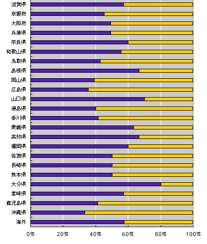 全体的には、年齢とともに「ものしり」率が 増えているようですが、 性差を持ってみると、ばらばらですね。 次は、住んでいるところ別です。 なにか違いが出るでしょうか?
