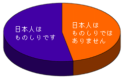 もう、ほとんど、半々です!! おふたりにおひとりはものしりです。 ケミストリーもドリカムもKiroroも ピンクレディーも狩人も、 ダウンタウンもアンガールズも 夢路いとし 喜味こいしも、 (‥‥二人組、おおいなあ‥‥。) どちらかがものしりで、 どちらかがものしりではありません。 これからは、「パフィーの、ものしりのほう。」 といった、ペアの区別方法が よく使われるようになるかもしれませんね。 この結果を「日本人の思いのものさし」でいうと、 「日本人は、わずかに、 ものしりではありません」 です。 ものしりさんに、覚えておいていただきましょう! ものしりではない方は、 わからなくなったらものしりさんに聞きましょう! 解決。 まあ、解決はともかく、 それぞれの集計を見てみましょう。