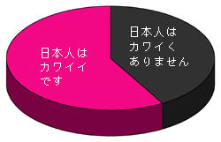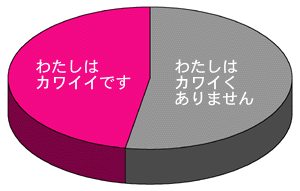 うーん。 いい勝負(?)でしたが、 わずかに「カワイくありません」が多くなりました。 途中経過も「カワイくありません」が 多かったのですが、 「意外です!」と驚いている方が けっこういらっしゃいました。 つまり、後の結果予想とも合わせると、 自分はさておき、「カワイイ」が多い という結果になるだろう、つまり、 みんなカワイイじゃん、 というのが多くの方の気持ちと言えます! この結果を「日本人の思いのものさし」でいうと、 「日本人は、微妙に、 カワイくありません」 うーん。 みんなが自分はさておき、と投票すると、 結局「カワイイ」は少なくなってしまう。 当然ですが、不思議な現象です。 さて、性別で見てみましょう。