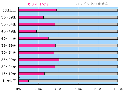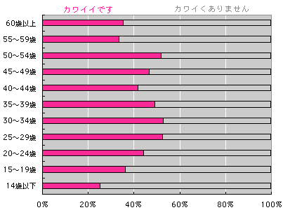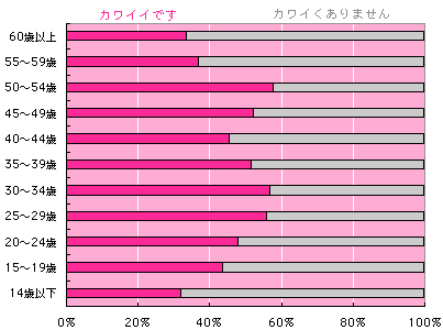 まあ、予想のできたことですが、 男性のカワイイが、 自己申告では少ないですね。 年齢別に見てみましょう。