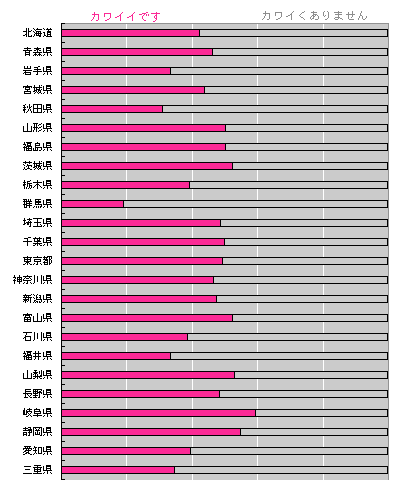 「カワイイです」ベスト5は 1位 海外 2位 岐阜県 3位 福岡県 4位 静岡県 5位 兵庫県 おおっと! 投票期間中に、いただいたメールの印象から、 「海外のみなさんはカワイイらしい」と 思っていましたが、 やっぱりです! ‥‥‥‥と、いうことは? カワイイ、海外流出中!! あ、さて‥‥。こほん。こちらも一応。 「カワイくありません」ベスト5は 1位 香川県 2位 群馬県 3位 広島県 4位 鳥取県 5位 秋田県 でした。 では、結果の予想です。