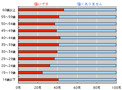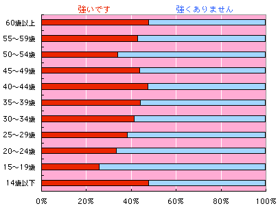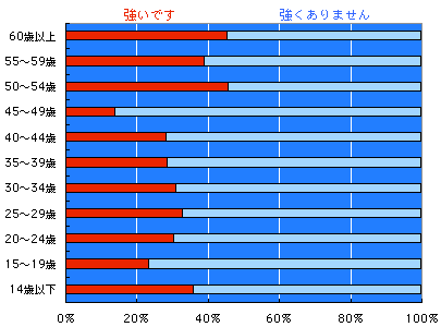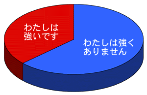 「強くありません!」 え、てことはイコール弱いの? 日本人、弱いの!? うーん。わたくし、国家機密を握ってしまったような 気持ちです。 外国の方に知られたら、こんな噂されてしまうかも。 「ニッポンジーン、チョーヨワーイ」 「ヨワヨワー。ヨワスギー」 むかっ。 あ、怒らなくてもいいですね。 わたくしー、のちほど紹介するみなさんのメールで、 「弱さ知る強さ」というものを 学んだばかりです。 落ち着いてまいりましょう。 さて、 この結果を「日本人の思いのものさし」でいうと、 「日本人は、かなり 強くありません」 うーん。 最終回だからでしょうか、 実は今回、メールを いつもよりたくさんいただいたのですが 内訳としては「わたしは強いです」という 内容のもののほうが多かったのです。 そのため、てっきり結果も、「強い」優勢かと 思っていました。 ニッポンジン、チョーイガイ。 イミワカンナイ。 さて、とにかく先へ進みましょう。 性別で見てみましょう。 ま、もちろん日本男児は、 強いはずですよね!