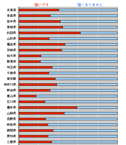 「強いです」ベスト5は 1位 海外 2位 高知県 3位 秋田県 4位 福井県 5位 沖縄県 「海外」の方が1位です。 やはり、環境の違うところで生活されていると、 強さを感じたり身に付けられたりすることが 多いのでしょうか。 高知‥‥秋田‥‥福井‥‥沖縄、は、 すみません、共通点が見当たらないのですが、 強いのですね! なにかに困ったときのために覚えてきます! 「強くありません」ベスト5は 1位 佐賀県 2位 長崎県 3位 富山県 4位 愛媛県 5位 島根県 あららららー。 強いとかいう噂の、 「九州男児」の産地である 佐賀と長崎が1位2位を独占です。 まあ、毎回のことですが、 相対的に、つまりまわりと比べてという ことかもしれません.。 それにしても九州男児、いわんや日本男児が 「はい、強くなかろうもん」ですか。 はー。 おもしろい! 率直なご意見、感謝いたします。 すっごく人間らしくて、鋤です! いえそれは農具です。 好きです!! では集計の最後は、投票時の、結果の予想です。