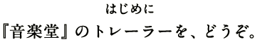 「『音楽堂』ができるまで。」は、 この動画からはじめます。 矢野さんのチームのみなさんから、 こころよく許諾をいただき、 10分ほどの、ショートムービーのような トレーラー(予告編)を 「ほぼ日」で配信させていただくことになりました。 予告編といっても、 映像作品の予告編ではなく、 音楽作品の予告編です。 『音楽堂』ができるまでの記録、 どうぞ、ごらんください。 |