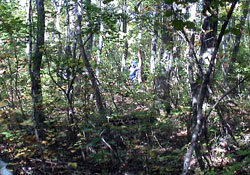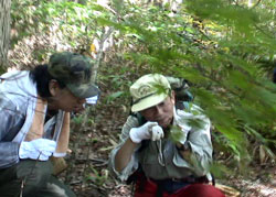 クマに会いませんように、会いませんように。 ここからしばらくは、また、 いちめんの薮のなかを進みます。 道のない薮をかきわけて歩くことを キノコギョーカイ用語では 「薮こぎ」と言うそうです。 足がからんでからんで。