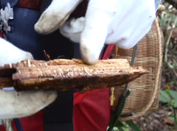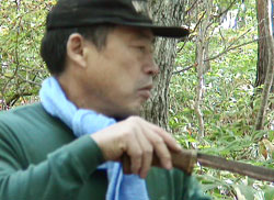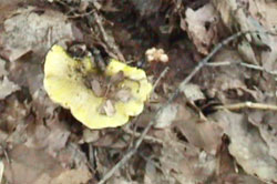 中山さんは、カバノアナタケを すっかり採り終えて、 またすごい勢いで進んでいます。 番長と西田さんが なかよくキノコを採るするようすを 動画でごらんください。 (↑こちらをクリックしていただくと、動画をごらんいただけます。) ワサビタケを味見したり、 いまキノコ界で注目のヤマブシタケを、 採っている映像も見られます。 アイシメジ発見。 黄色くて、見わけのつきやすいキノコです。