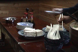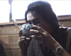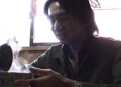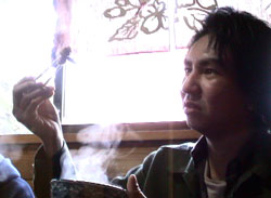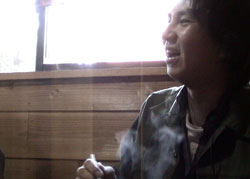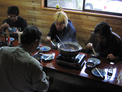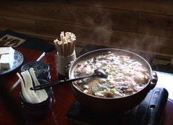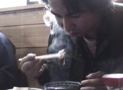 これはなんのキノコだろうな? アブラシメジかな? あっっつ。 フハフハ、ムシャムシャ。 ズズズー。 もういっぱい。 キノコが少なくなると、 乾麺のきしめんをバリバリに折って入れて‥‥ あ、さらに食ったらまたうまい。 ズズズズー。 ZZZZZー ZZZZZーん? くり返し鍋に手をのばす番長。