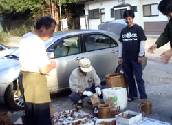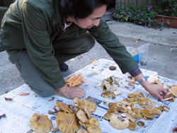 ■ニュース その1■ キノコ狩り、恐怖の迷宮。 第12回 知らないあいだに、キノコ鍋が。 中山さんのお店に到着した 田島貴男ニュース番長は、 採ったキノコを 新聞紙に並べて選定します。 食べられるキノコを選び、 これから料理しようという算段です。 どうやら、番長は、意外に「量」を採っています。 そして、持って帰ってくるのがうまいらしく、 全部のキノコのかたちがきれいに整っています。 「きれいに持って帰ってきたねぇ」 と、キノコ・ザ・トリオのみなさんも、 ほめてくださっています。 本日のお宝キノコオールスターです。