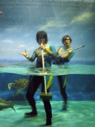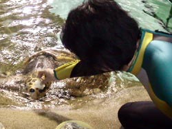 威嚇をしていたあいつにも ゆうゆうと近寄れるようになりました。 そのようすを動画でごらんください。 (↑こちらをクリックしていただくと、動画をごらんいただけます。) 水槽の向こう側は、けっこうな人だかり。 でも、誰も「取材」で掃除しているとは 思ってないです。 誰もミュージシャンが掃除しているとは 思ってないです。 誰もオリジナル・ラヴが掃除しているとは 思ってないです。 それは番長が必要以上に 一心不乱に床に腰を入れて ブラシをかけているからです。 さあ、これでカメとお別れですよ。