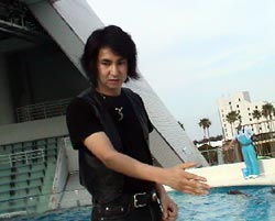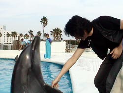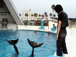 あ! 「握手」が決まりました、 決まりました。 番長、ものすごくうれしそうです。 次は、番長の指揮に合わせて2匹が ピー、ピキュー、ピー、キュー、と 鳴きます。 ひゃあ、かわいいですね! ここはマリンワールドですよ、 クリスマスのNHKホールではありませんよ、 というくらい、ダイナミックな指揮です。 自信がある分野では、番長はつねに やりすぎる傾向にあるようです。