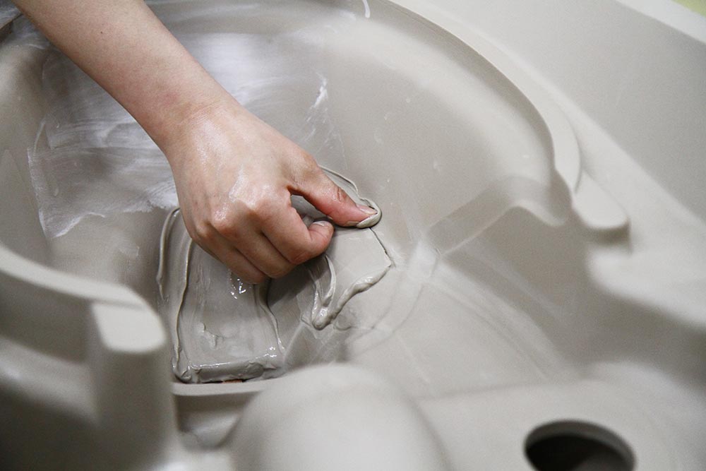 陶器でできている便器は、熟練職人さんの「巧みな手業」によって完成する。