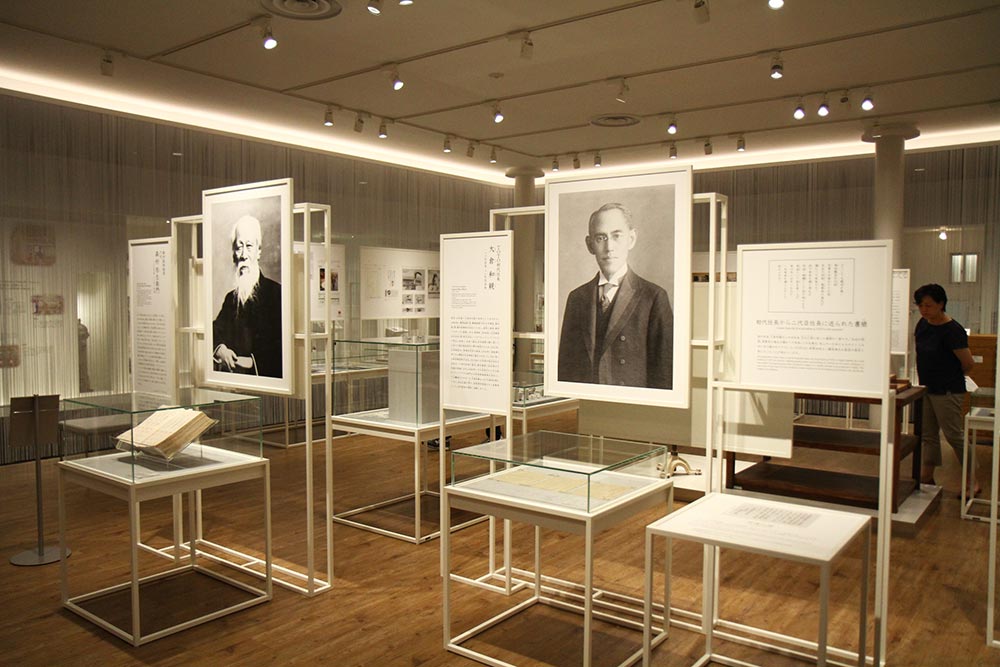 TOTOミュージアムに飾られた、初代・大倉和親の肖像写真(右)。