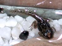 | 5月19日(金) 手足の生えてきた子が増えてきた。 えら呼吸から肺呼吸に変わるらしく、 そういう子たちは水面近くまで上って 口を開けて空気を吸っています。 昨日までは25センチくらいの水深の下の方に、 みんな、いたんだけど、 今日は半分以上が上の方にいる。 やっぱり大人になると屋上に上がって タバコふかすようなもの? 違うか。 そういう様子に気づいたセイヒローが水を抜き、 玉砂利で陸地がつくれるくらいまで水深を下げた。 水中で上下運動はできなくなったけど 一応泳げる海の部分が3分の1、 ひたひたに水がある砂浜のような部分が3分の1、 残りは陸になりました。 手足の生えた子は、ひたひたの場所が好きみたい。 ところで、こんなメールをいただきました。びっくり。 **************************** こんにちは はじめてメールします、ケロ太と申します。 毎日おたま達の生活、楽しみに見ています。 私はカエルマニアです。 いつも心の片隅でカエルをさがしている、そんな人生です。 さて、さきほど今日のdarlingのひとことのところで 拝見したのですが、前足が今朝になったら 急に生えているとのことですね。 ご存知かもしれないのですが、 カエルの足というのは前も後ろもですが、 ある時突然ビョン!と飛び出してくるんだそうです。 ニョキニョキと生えてくるのではなく。 だから、1匹のおたまをずーーーーっと見ていると、 そのビョン!の瞬間を見ることができるらしいんです。 そんな私はまだ見たことがないのですが。 それでは今日はこれで。 これからもおたまの成長を楽しみにしています。 ケロ太 ***************************** ビョンって。……み、見たい! と思って観察してみたら、からだのつけねの部分に、 足になりかけの、筋のようなものが うっすらと見える子がいました。(撮影はできなかった) ヒナが卵を破って出てくる見たいなものかもね。 |