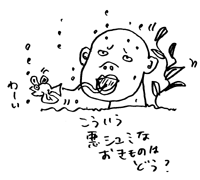 | <金魚のうつらない日もあった> やってみたいけどぜったいやらないだろうなあと 思っていることのひとつに 「人間ポンプ」がありまして ほら、おっさんが金魚呑み込んで またゲポッと吐き出すとあらフシギ 金魚は元気でした、っていうアレ。 あれって金魚、どんな気分なんでしょうね。 けっこう気持ちいいんじゃないか。 咽のあたりなんか、つるっとしててすべり台みたいだし 胃には食べ物だってあるぜ。あ、水はないか。 ともかくスリル満点(←死語?)だしさ、 きっと生きて帰れるしさ、 僕(シェフ)にもうちょっと勇気があったら 君らにそういう思いもさせてあげられるのにねえ、 と、水槽をじっと見つめて考えました。 そういうばかなことを考えていると さらにばかなことを思いつくもので、 こういうのどうでしょう。 もちろん生身じゃないのよ。 陶芸とかでつくって、中を金魚さんたちの プライベートハウスにするわけよ。 空気を中にちょっとためてて、 たまると口から「げぽっ」って出るの。 誰かつくってくれないかなあ。 リアルすぎるとこわいけど 慣れればかわいいかもしれないし。 いや、うそです、本気じゃありません。 ところで、木曜の夜は326くんライブがあったし そのあと、カメラが断線していたらしく (メリー木村が調べたら、電源コードが ぷっつり切れてたんだって!) ちょっとの間、金魚が見れなかったみたいです。 すみません。 でも、カメラにうつらなかった間も ちゃんと金魚は元気でした。ご安心ください。 エサはたっぷりあげたし (僕がダイエット中だからね、そのぶんたくさんあげた) 水量も増やしました。 でも、木工用ボ、の休暇中に なにか気の利いたイタズラをと思っていたのに できなかったなあ。ざんねんだ。 というわけでシェフ武井でした。 |