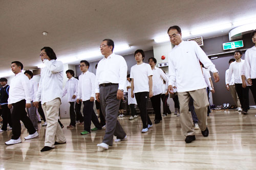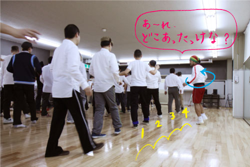 | 次は、左足から4つ歩いて 元の位置に戻るんですが、 さっきとはちょっと違って、今度は クルっとまわりながら歩きます。 「あ〜れ、どこにあったっけな?」 という感じ。 |