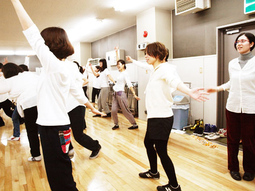| ワントゥースリフォー、 右足でまわりますよ! はい! ポーズ! |