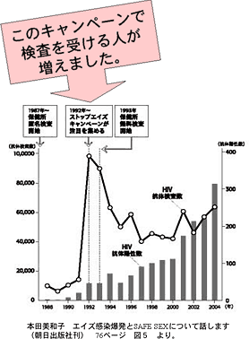| 手紙198 日本のHIV ひとりストップエイズキャンペーン始めました・2 今度の日曜日の朝、NHKラジオをぜひ聞いてください。 こんにちは。 前回の掲載の後 たくさんのメールをいただきました。 ありがとうございました。 しみじみと、とてもうれしかったです。 ひとりキャンペーンの話の続きをしようと思います。 かつて、日本でHIV感染症が 社会的に大きく取り上げられた時期がありました。 当時の厚生省と広告代理店などが協力して行った、 1992年のストップエイズキャンペーンです。 数多くの著名人も参加して行われた このキャンペーンの結果、 多くの人の耳に 「HIV感染症/エイズ」という言葉が届き、 この年にHIV検査を受けた人は 10万人に迫る勢いでした。 しかし、この勢いはすぐに失速して 3年後には5万人あまりへと半減してしまい、 その後も検査を受ける人の数は 微増にとどまっています。 日本でのHIV検査を受けた人数と HIV感染者数の変化についてのグラフを ご覧下さい。 ![]() 92年のストップエイズキャンペーンの 一時的な盛り上がりとその後の衰退が、 多くの人に 「HIVは昔問題になった病気である。 (そして、今はない)」 と思わせてしまっています。 ストップエイズキャンペーンは、 1992年後もずっと続けているそうなのですが、 なかなか多くの人の心に届く形になっていません。 HIV感染症は 自分で「検査を受けよう」と思わなければ 調べることはできません。 グラフでお示ししたように、 92年のストップエイズキャンペーンでは 前年の5倍以上の方が検査を受ける、という 大成功をおさめました。 そして、その後すごい勢いで 検査を受ける人は減っています。 検査を受ける人がいなければ、 HIV感染を見つけることができません。 そうすると、 病気がとても進行して何か症状が出るまで ご本人は 自分の感染を知らぬまま過ごしてしまい、 結果的に手遅れになってしまいます。 このグラフを、いつも 「残念だなあ」と思いながら見ていたのですが、 一年前の今頃、 「じゃあ、誰かがまた たくさんの人にアピールする キャンペーンをやってみたらいいんじゃないか」と 思いつきました。 内科医として 病院の診察室で、 既にHIVに感染した人が 受診してくれるのを待っているのでは、 あまりに消極的で、しかも手遅れです。 HIV感染症は自分には無縁だ、と思っている 圧倒的多数の日本の方々に、 「必ずしもそうではない」ことをお伝えするために、 また誰かが新しく、効果的なキャンペーンを 展開してくれるのを願いながら じっと待っているのでは、 もうだめだ、という気になってきました。 誰か、というのでは 誰だかわからないので、 とりあえず、自分でやってみることにしました。 こうして わたしのひとりキャンペーンは始まりました。 ひとりで始めるキャンペーンというのは とても便利です。 まず、第一に、気軽に力を貸してもらうことができます。 「ねえねえ、ちょっと困ってるんだけど 相談に乗ってくれない?」と お願いすると、 不憫に思って助けてくれる、 友人や知人や上司が次々に現れました。 本当にありがたいことで、深く感謝しています。 そして、今日は この手紙を読んでくださっている方に ぜひお願い申し上げたいことがあります。 ご縁があって、今度の日曜日(6月4日)の朝 NHKラジオで15分ほど、 日本のHIV事情について話しても良い、という インタビューの機会をいただきました。 NHKラジオ第1放送の「あさいちばん」という番組の中の 「日曜訪問」というコーナーです。 夢のような話です。 しかも、この放送は世界中どこででも聴けます。 NHKラジオの国際放送、 NHKワールド・ラジオ日本でも 「日曜訪問」は放送されるのだそうです。 NHKラジオのサイトでも紹介してもらっているので もしよろしければ、ご覧になってみて下さい。 ページの右上です。 日曜日の放送までは掲載されていると思います。 世界各地の地域別の周波数と放送時間は ここでわかります。 放送は、日本時間の 6月4日朝7時39分頃から55分ごろまでです。 お休みの日の早朝ですが、 もしお時間があえば ぜひお聞きくださいますようお願いいたします。 そして、もし、ひとりキャンペーンに 力を貸してもよい、とお考えの方がいらっしゃれば ぜひ、感想をNHKに届けていただけないでしょうか。 こんなずうずうしいことをお願いする理由はひとつです。 もし、ラジオの放送に反響があれば、 NHKの他の番組でも紹介してもらえる可能性が あるかもしれないのだそうです。 HIVのことを 多くの方に知っていただく機会を増やすために、 ぜひ、読んでくださっているみなさまの お力をお貸しください。 NHKラジオでは 聴取者からの意見や感想を インターネットや電話で受け付けています。 ウェブサイトは https://www.nhk.or.jp/plaza/mail_program/radiodir.html 、 電話の場合は視聴者コールセンター 電話0570-066066 です。 こんなことを 読んでくださっている方々にお願いするのは どうかしてる、と自分でも思いま