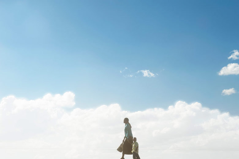 移動中のバスの窓の向こうに、一組の親子が歩いていました。