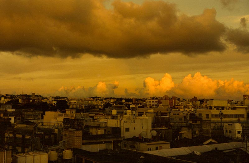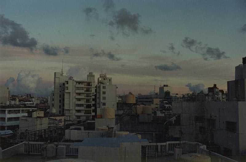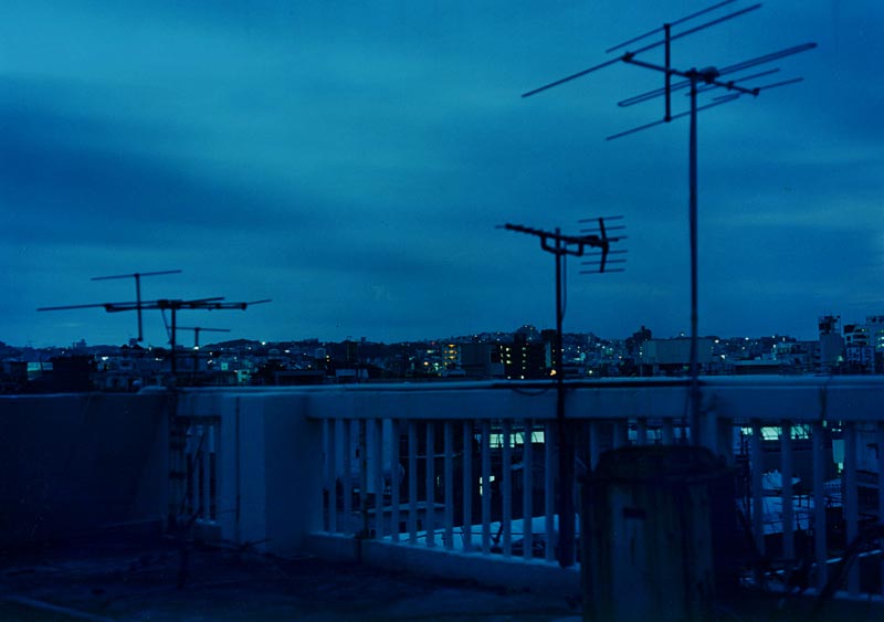 エンディングのシーンと同じ場所でもあるビルの屋上より見た那覇の街並み。時はまさに“マジックアワー”。この時間はそこにある光が、影をなくしてしまうほど360°均等に存在することで、色の世界にも、独特のやわらかい色彩が生まれます。このあいまいな光の中では、ホワイトバランスを機能するのはかなり難しいのでは。ぼくも、プリント時にとても苦労しました。