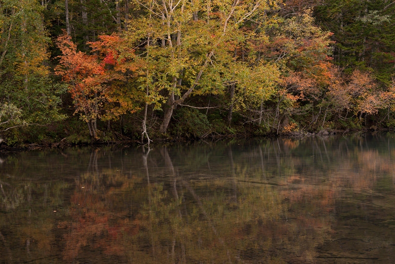 先週、ちょうど紅葉が始まったばかりの北海道を訪れました。「少しずつ始まってきたなあ」と湖畔に出ると、水面にも紅葉が反射して、そこだけが“あかく”染まっていました。思わずシャッターを切ったのですが、写し出された写真には、その“あかさ”が写っていませんでしたので、現像時に“あか”を調整して、その時の印象に近づけてみました。