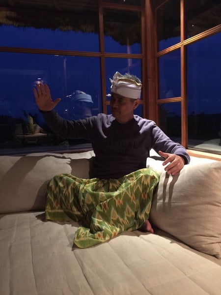 おとうさんは、ビーチで食事です。