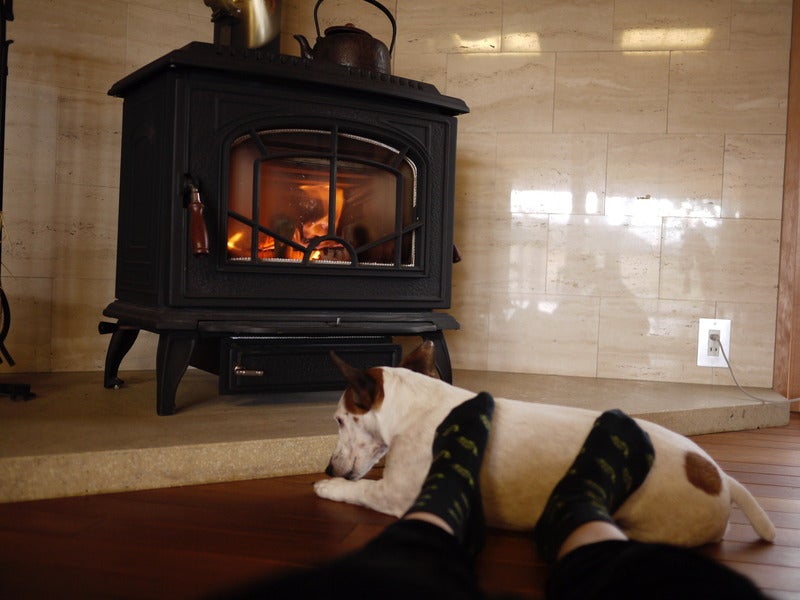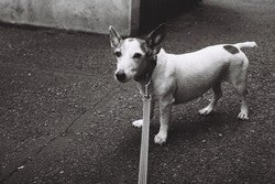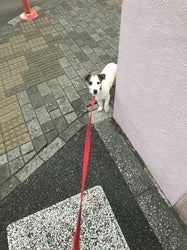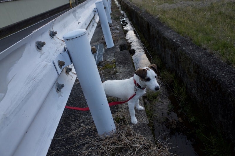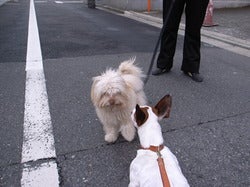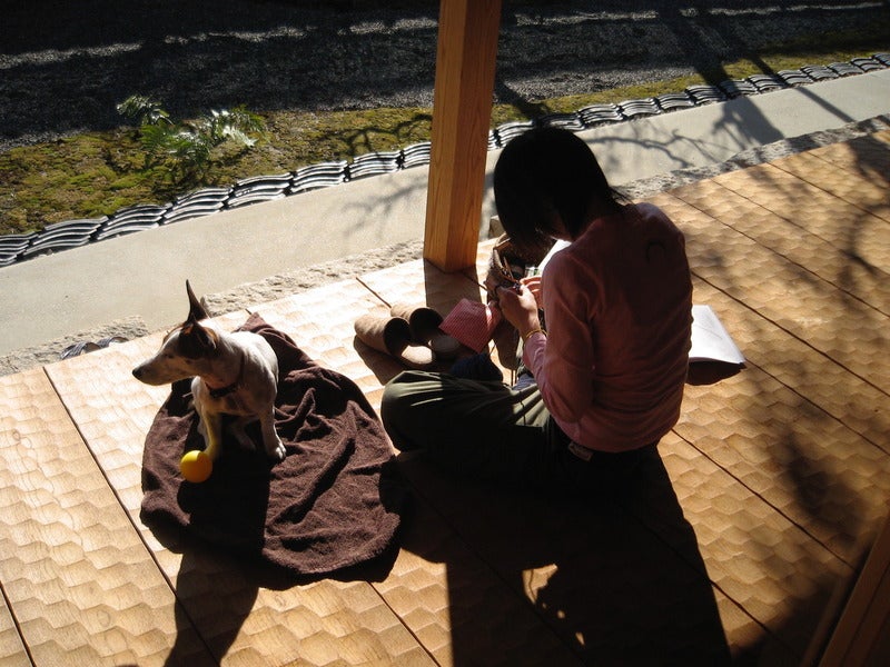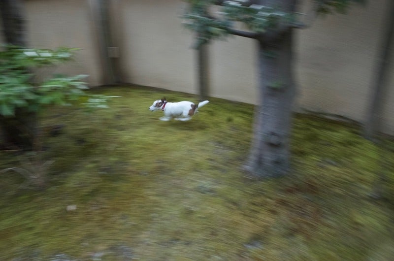 京都で、庭を走り回る犬。