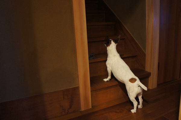 階段のところで待っています。