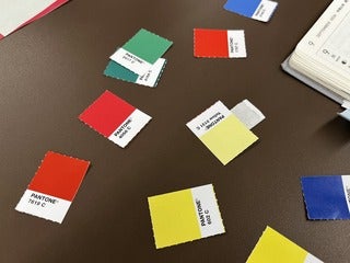 たくさんのPANTONE(世界共通の色見本帳)を前に