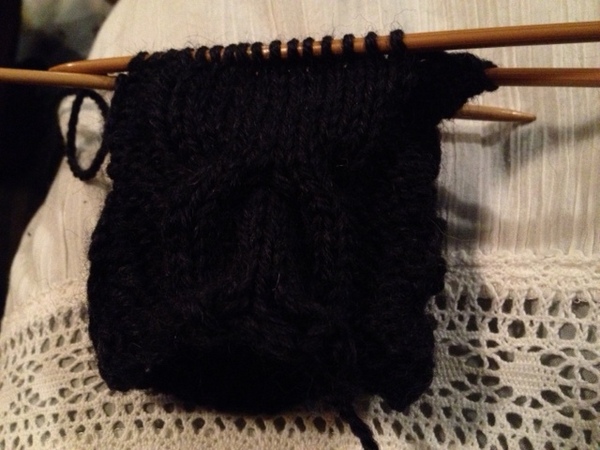 午前中、わたしの手袋は、ここまですすみました。暗くてわかりにくいけど、ねじねじケーブル編みです。この編み図もすごいなぁ、ぜんぜんあきないですよ、三國先生。