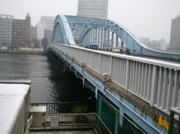 歩きはじめて1時間。隅田川にかかる永代橋までやって来ました。義士たちはこの橋から江戸の街に入って行きました。雪、降り止まず。あと1月もたてば桜が咲き誇る、墨田堤は今日は寒さに震えて見えます。