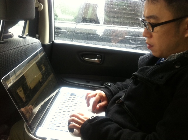 到着するなり、車中で中継機材の テストをはじめたベイさん。 万が一、何かあった時に機材を 買い足しできるように 山に登る前に 済ませておきたいそうです。 |