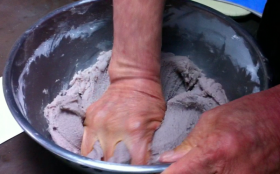 あんこと粉、砂糖などをあわせて練ります。 この練り方を