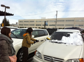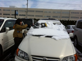 一ノ関の駐車場に停めてある 社用車のフロントに雪が、 デザイナー山川みちこが、 それをとりのぞく。 すごいぞみちこ。 デザインもうまければ 雪あつかいもうまい。 |