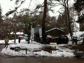 カレイコース、 中尊寺に着きました。 中尊寺は雪です。きれいです!