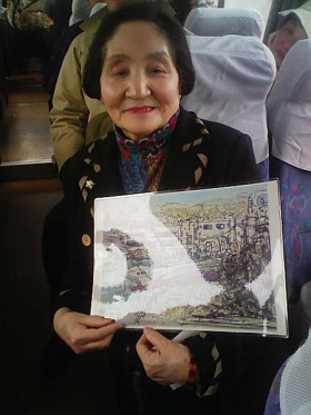 無添加さんまつくだ煮の お店を経営する、 菅原義理子さん。 持っていらっしゃるのは、 震災から3日後に描きになった絵。 そのときの気持ちが 伝わるようです。 |