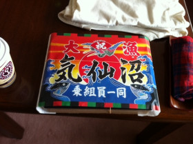 今日のために、 気仙沼のみなさんが つくってくださったお弁当です。 包み紙の絵柄は、 気仙沼で大漁旗をつくっている 菊田染物屋さんの デザインだそうです。 |