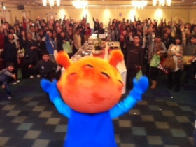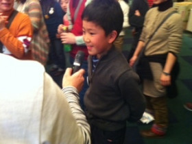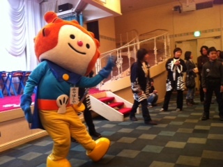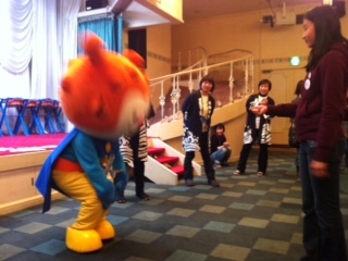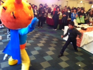 ドンドンドンドンー パフパフー ホヤぼーやのジャンケン大会が はじまりましたー。 ホヤさん、よろしくお願いします! 体力の続くかぎり! |