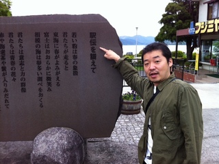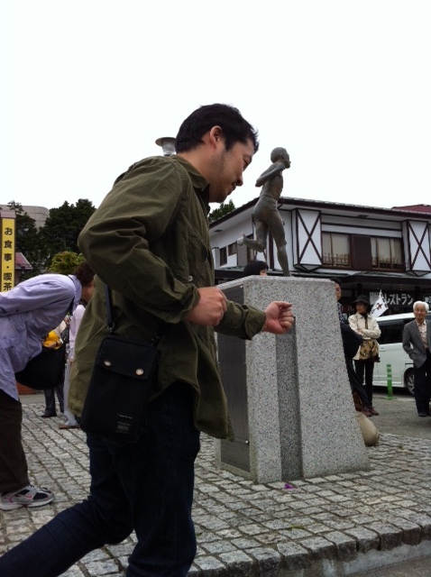 駅伝ミュージアムの近くに駅伝往路ゴールの碑があったので、べっかむ3にゴールしてもらいました。なんとなく、目的は果たした気分‥‥あ、いえいえ!もちろん金環日食がメインですよ。そんなの当たり前じゃないですか、我々忘れておりませんよ、ほほほほ、ほほー。