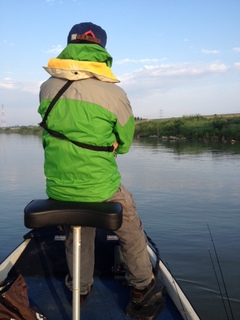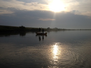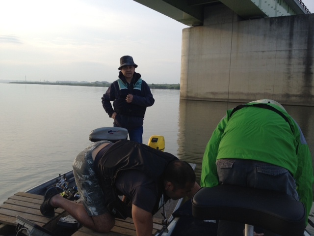 そのご、すったもんだがありまして、山下曰く、「ミッションインポッシブルみたいだった!」とのことで、乗ってるわたくしとしては、もう振り落とされないようにつかまっているのに必死で、なにがなんやら。気づいたら、自分の目線に水面が!その結果、社長のおしりはびしょ濡れ、わたしは足をすりむき。しげさんと、山下さんが舟を乗り換え、釣りをはじめております。にやにや。