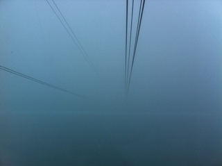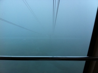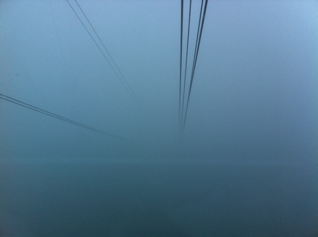 駒ヶ岳ロープウェーは、中間地点を過ぎて、霧の中に突入しました。な、何も見えねぇ!とりあえず、山頂で降りて、東側をチェックだ、ジャスミン刑事!